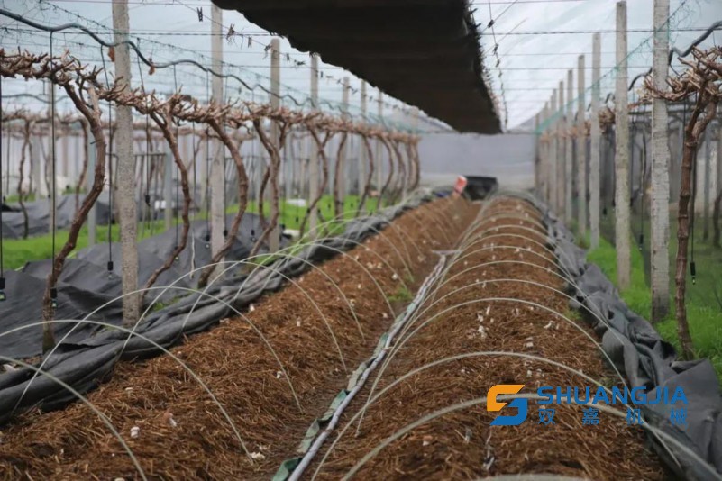 葡萄套種大球蓋菇技術(shù)以玉米、稻草等農(nóng)作物秸稈、葡萄枝條等農(nóng)業(yè)廢棄物作為栽培原料,按照一定比例混合并進(jìn)行20天左右堆料,按照既方便大球蓋菇操作又不影響葡萄冬季管理的原則,在葡萄架下設(shè)置種植畦,將菌種植入其內(nèi),通過控溫保濕和滅菌管理,40天后就可以出菇。