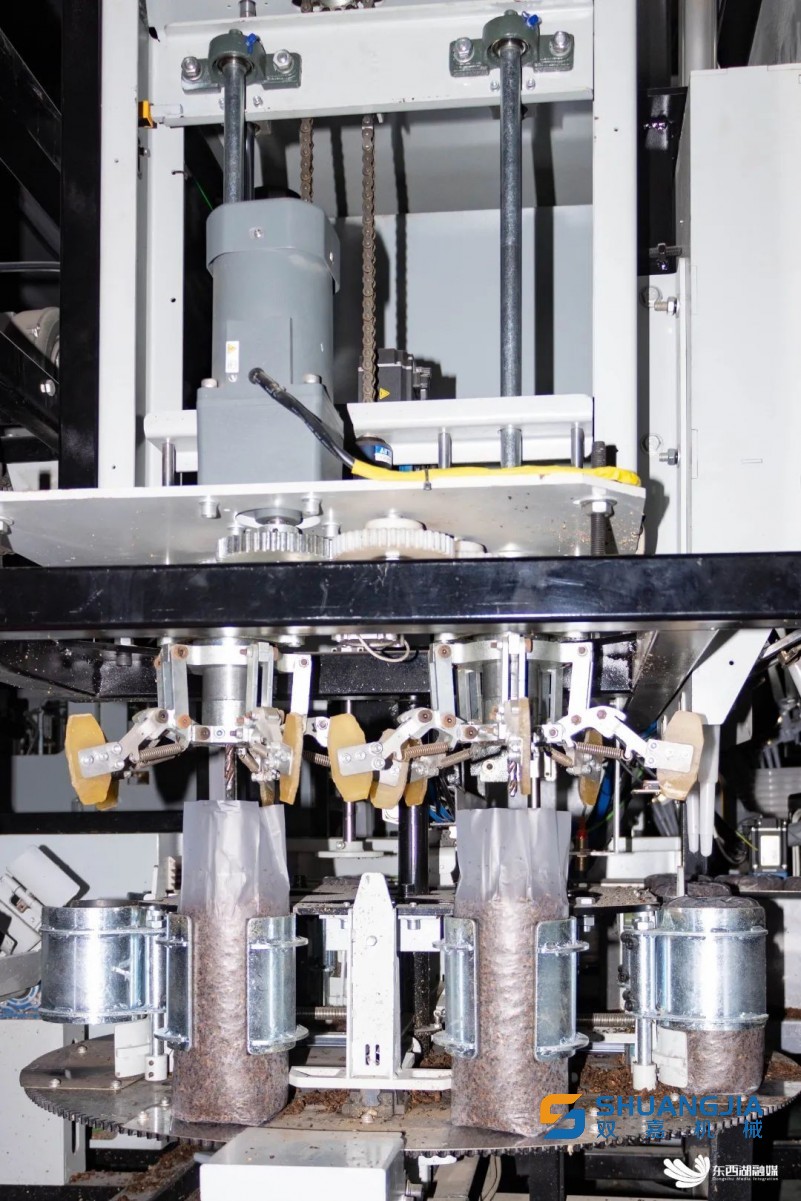 在自動裝袋區(qū),生產(chǎn)線代替人工完成套袋、填料、窩口、插棒、裝袋進(jìn)筐等一系列復(fù)雜動作。立式螺旋填料方式讓裝料更密實,每包菌棒長度、重量一致。