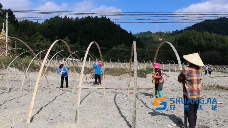 棚架搭建現(xiàn)場(chǎng),村民們分工明確,配合默契,搬運(yùn)竹片、定位對(duì)齊、挖孔、固定,整個(gè)流程動(dòng)作嫻熟高效。在眾人的努力下,竹制結(jié)構(gòu)的大棚初具形態(tài)。